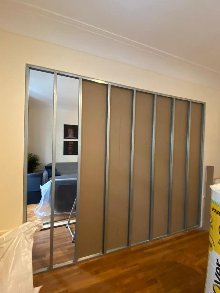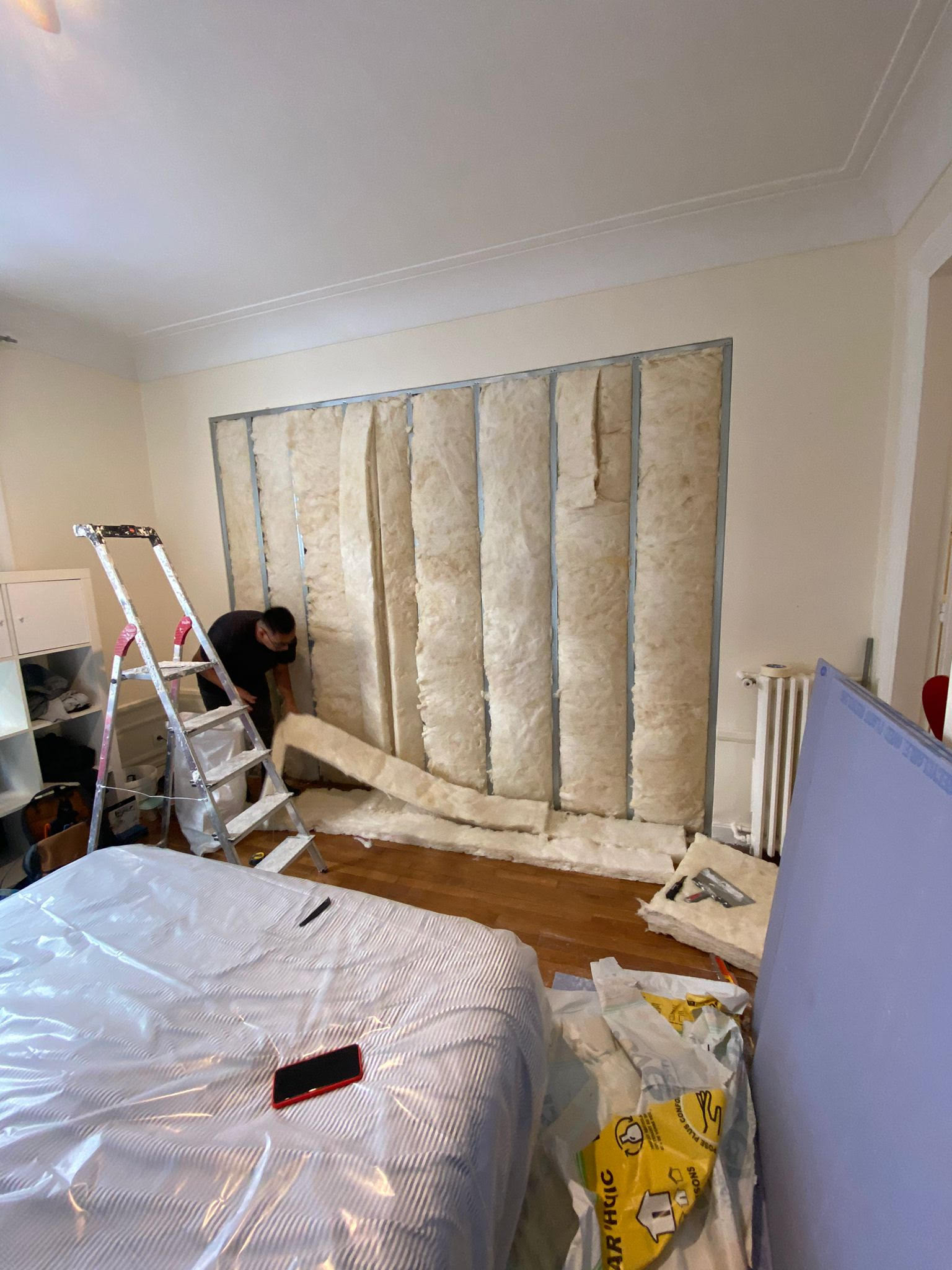 Cloison phonique 3x 2,5m avec laine de verre , plinthes , enduit et peinture à Paris 75015 , budget 2200€