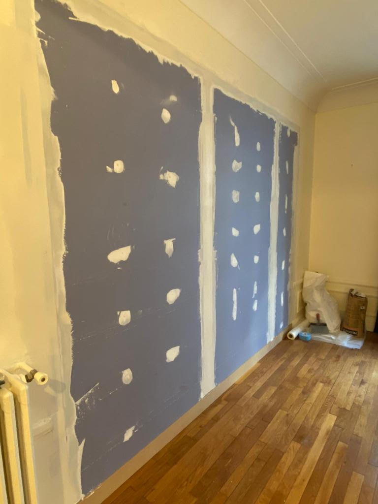 Isolation mur chambre, plinthes, enduit partiel, entoilage plafond et peinture complète à Paris 75015, budget 4900€.