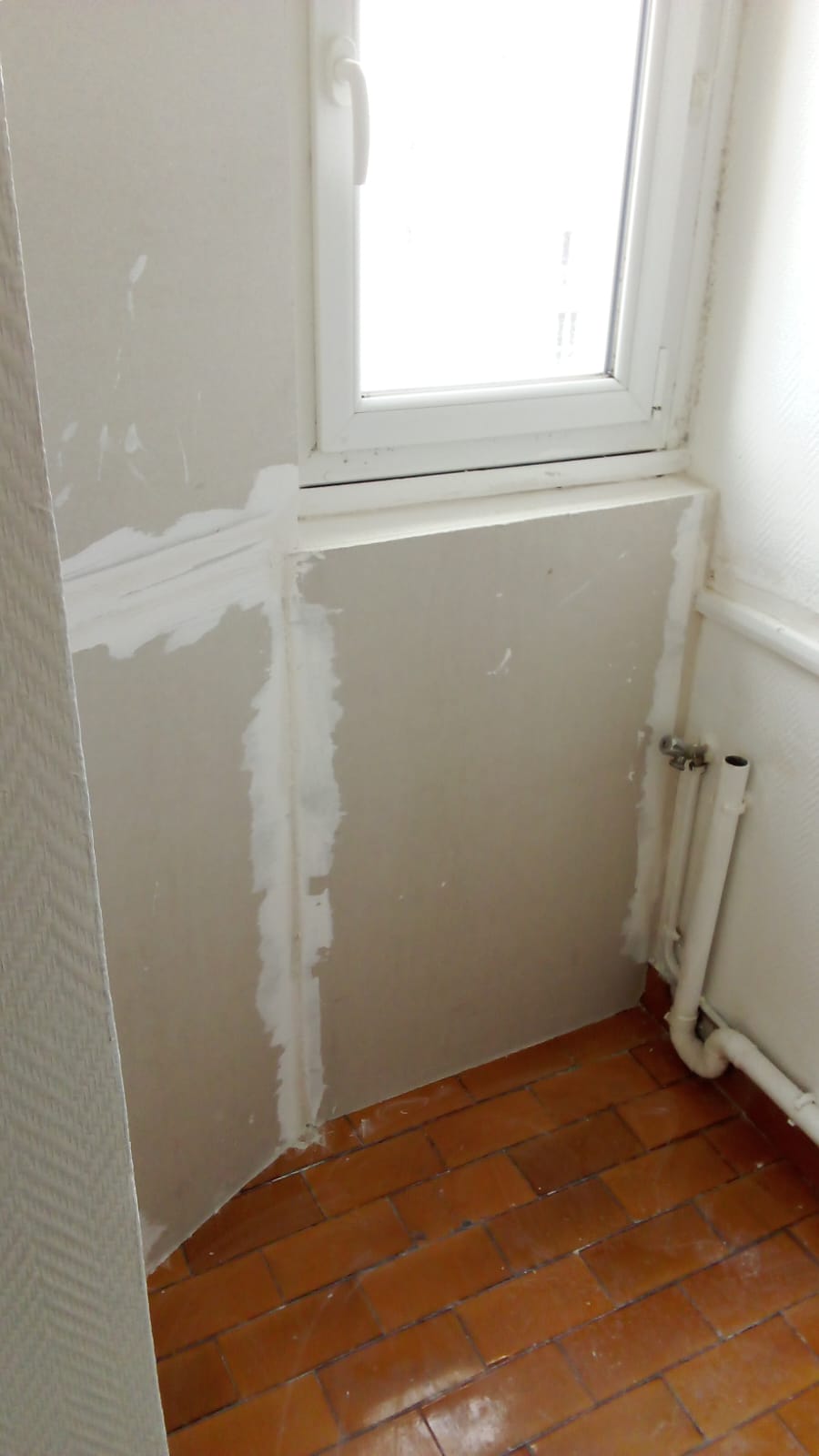Isolation placo et polyuréthane épaisseur 10cm coef R 375 , mur 1,80 x 2,55 m. avec bandes et peinture cuisine à Paris 15ème budget 2200€.