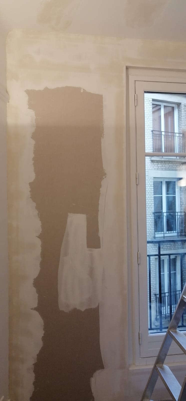 Dépose papier peint , une couche d’impression , trois couches d’enduit intégral , deux couches de peinture et deux murs en couleur à Paris 75015 Budget 3000 euros