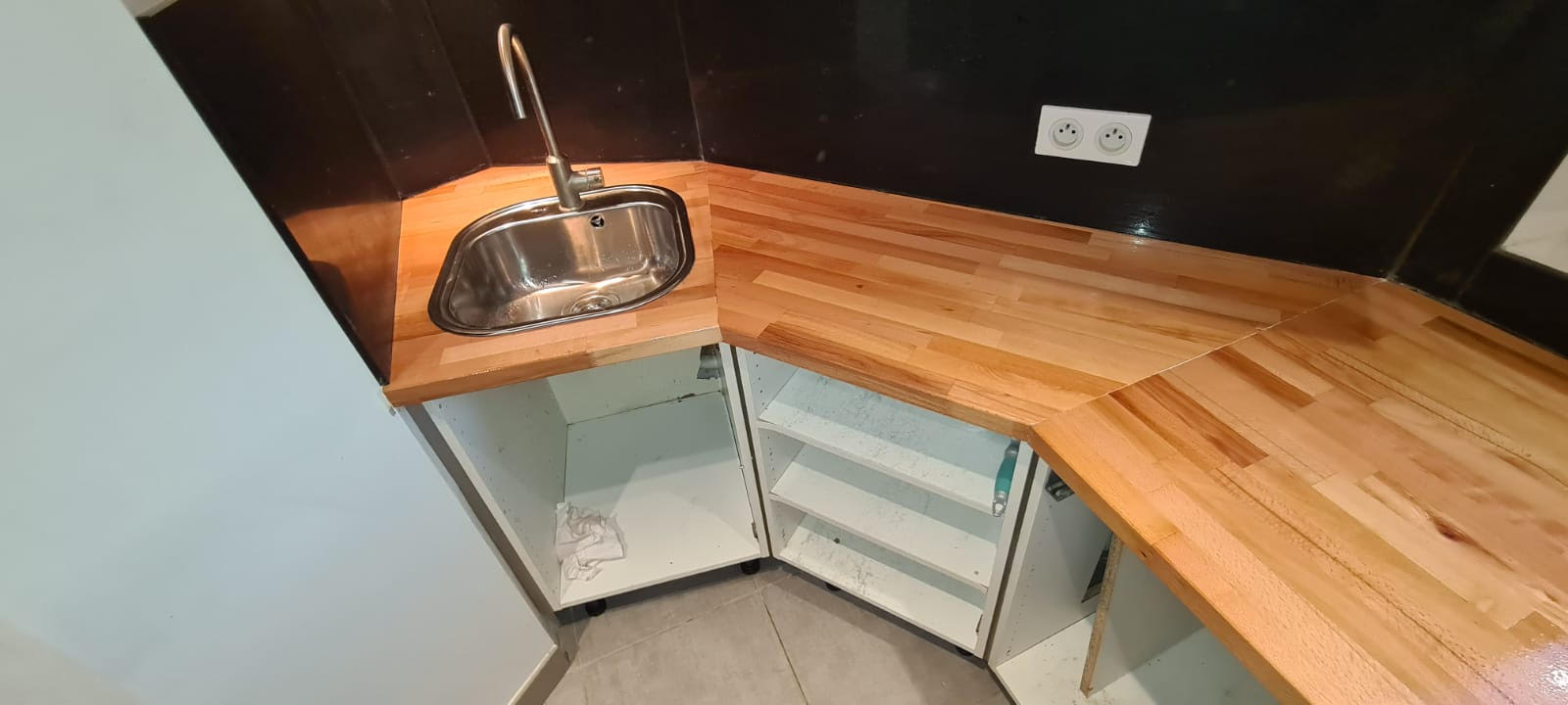 Remplacement kitchenette inox par plan de travail évier et plaque induccion budget 1200€ à Paris 75007.